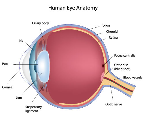 Pupil: the dark center in the middle of the iris. The pupil determines how much light is let into the eye.