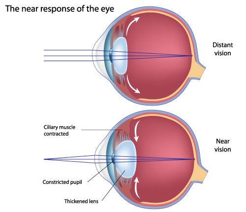 The human eye is similar to a camera. Light enters the cornea, a transparent cover that resembles a camera aperture. The iris, similar to a camera shutter, opens and closes (making the pupil bigger and smaller) to regulate the amount of light passing through. The light rays pass through the lens and focus on the retina. Like a camera film, the retina senses the incoming light and creates electrical impulses. These impulses are sent via the optic nerve to the brain where an image is produced.